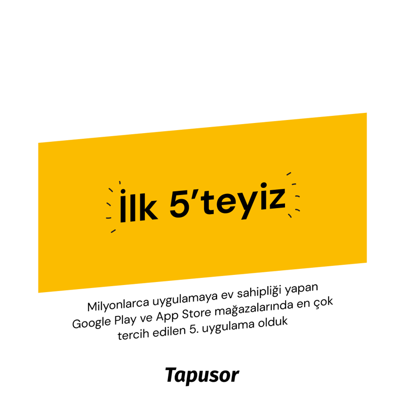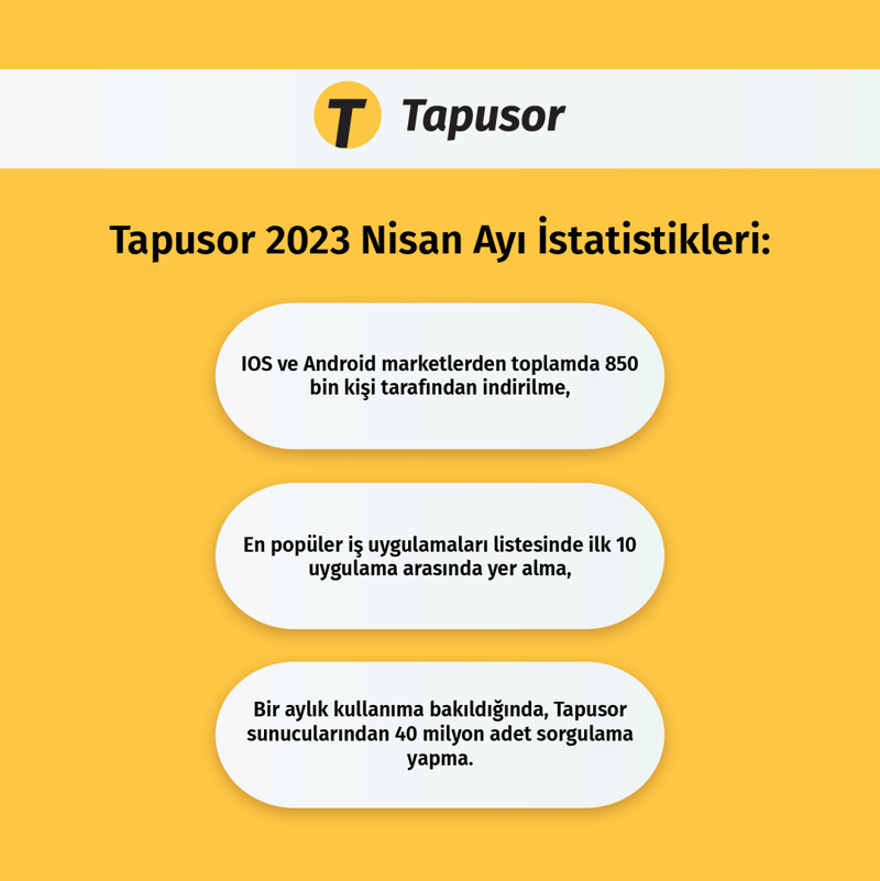 Tapusor 2023 Nisan ayı istatistiklerine göre IOS ve Android marketlerden toplamda 850 Bin kişi tarafından indirilmiştir. En popüler iş uygulamaları listesinde ilk 10 uygulama arasında yer almaktadır. Sadece bir aylık kullanıma bakıldığında sunucularımızın 40 milyondan fazla sorgu çağrısına cevap verdiği görüntülenmektedir.
