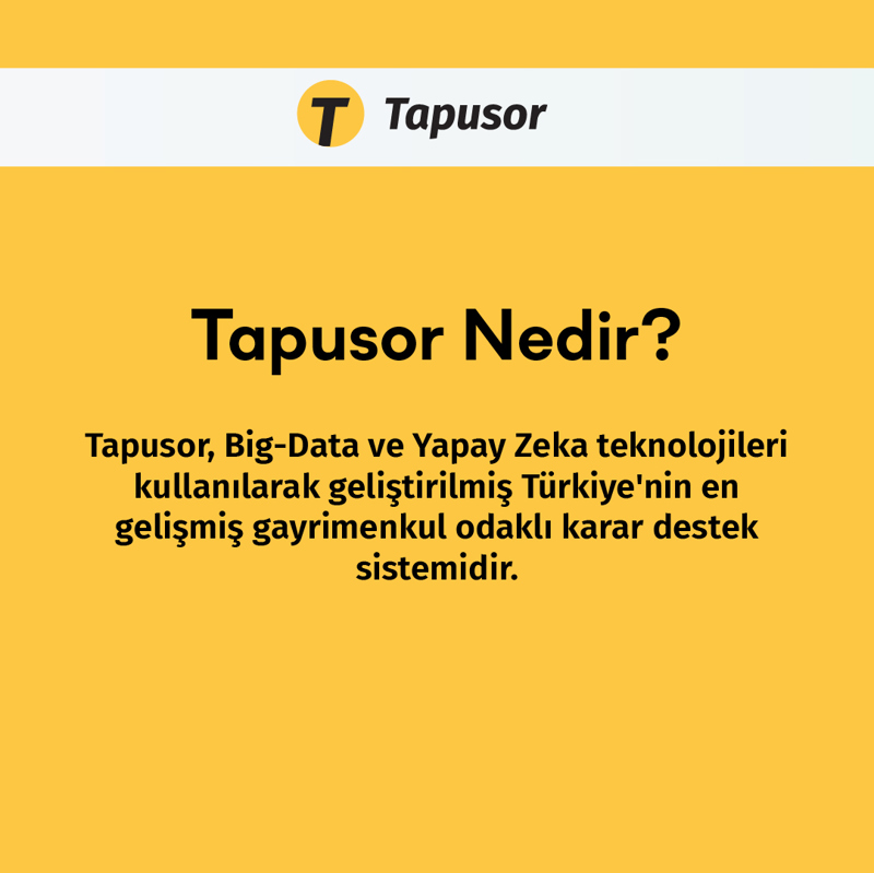 Tapusor, Big-Data ve Yapay Zeka teknolojileri kullanılarak geliştirilmiş Türkiye'nin en gelişmiş gayrimenkul odaklı karar destek sistemidir. Tapusor yazılımı, gayrimenkul sektöründe bir mülke ilişkin değer tahmini, fiyat geri dönüş oranı, arz talep hareketleri, teknik bilgi, sosyo ekonomik istatistik, yatırım puanı, imar bilgisi, kentsel dönüşüm, deprem risk puanı, kamulaştırma, sit alanı, orman alanı gibi yüzlerce başlıkta bilgiyi, kolay okunabilir raporlar halinde sunar.