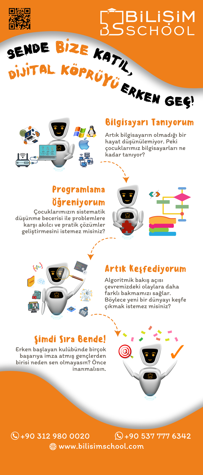 Bilişim School projesi ile odak noktamız, öğrenmenin temellerinin atıldığı ve hızlı geliştiği dönem olan lisans eğitimi öncesi (8-18 yaş) dönemdir.