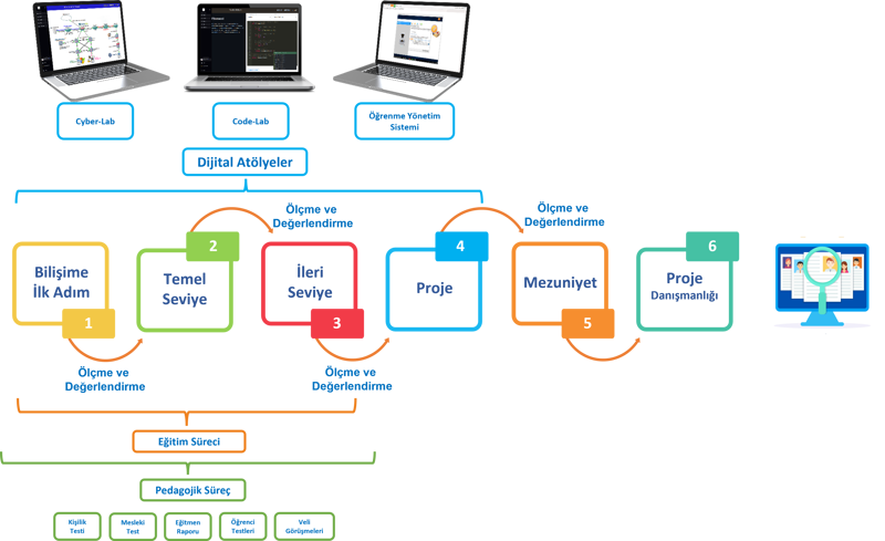 Bu bakış açısıyla; okul öncesi dönemde problem çözme becerilerinin geliştirilmesi hedeflenirken; okul dönemi ile birlikte, algoritmik bakış açısı yardımıyla erken dönem proje geliştirme mantığı kazandırılması amaçlanmaktadır. Lise döneminde ise gençlerimizin sektörel ihtiyaçlar doğrultusunda yetiştirilmesinin geleceğe ışık tutacağına inanıyoruz. Bu kapsamda; Siber Güvenlik, Web Uygulama Geliştirme, Mobil Uygulama Geliştirme, Oyun Programlama, Yapay Zekâ ve Makine Öğrenmesi konularında kapsamlı program ve dijital atölyeler (Code-Lab, Cyber-Lab) hazırlıyoruz. Yetenek havuzumuza aldığımız gençlerimizle bilimsel ve sektörel değeri olan projeler üreterek ülkemize katkı sağlamayı amaçlıyoruz.