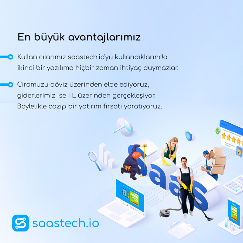 saastech.io, piyasada ayrı ayrı startup'ların sunduğu her bir özelliği tek bir platformda bir araya getirerek öne çıkmaktadır. En büyük avantajı ise tüm çözümlerin saastech.io'da birleşmesidir. Kullanıcılarımız saastech.io'yu kullandıklarında ikinci bir yazılıma hiçbir zaman ihtiyaç duymazlar. Çünkü saastech.io gereken her türlü teknolojiyi, 10 yıllık bir know-how'a dayanarak müşterileri adına düşünmüş ve geliştirmiştir. Bu çözümler, yıllardır birçok temizlik, servis ve hizmet şirketi tarafından 7 ayrı ülkede başarıyla kullanılmaktadır.