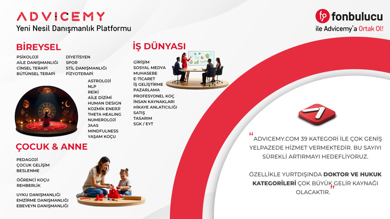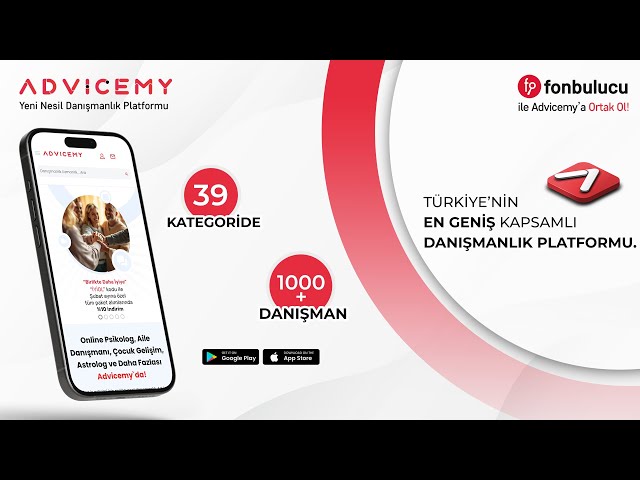 Advicemy, 39 farklı kategoride 1.000’den fazla danışmanla hizmet veren, Türkiye’nin en büyük online danışmanlık platformudur. 2019 yılında 8 danışmanla kurulan bu platform, psikoloji, aile danışmanlığı, diyetisyenlik ve astroloji gibi alanlarda kullanıcıların uzmanlarla görüntülü görüşme yoluyla iletişime geçebileceği bir dijital hizmet sunar. iOS ve Android uygulamaları ile desteklenen Advicemy, globalde 100’den fazla ülkeye hizmet vermektedir.