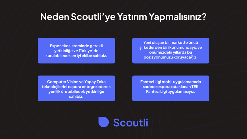 Scoutli, espor takımlarının ve koç ekiplerinin scouting ve analiz süreçlerini optimize etmek amacıyla kurulmuş, hali hazırda gelir elde eden, 3 yatırım turunda toplamda 100.000 dolar yatırım alan ve güçlü bir ekibe sahip SaaS gelir modeli ile faaliyet gösteren bir yazılım şirketidir. Dünyanın en hızlı büyüme oranlarından birine sahip (CAGR %26) espor pazarında faaliyet gösteren girişim şirketi Counter-Strike: Global Offensive (CSGO), PUBG: Battlegrounds, League of Legends, VALORANT, PUBG Mobile gibi dünya çapında aylık 800 milyon oyuncu sayılarına ulaşan espor takımları ve koç ekiplerinin standardize edilmiş bir oyuncu keşfetme süreci olmaması sebebiyle Scoutli tam bu noktada çözüm üretmektedir. Yaratılan 40 farklı veri noktasına dayanan oyuncu değerlendirme algoritması ile takımların scouting süreçlerini standardize etmektedir ve oyuncuların kolay şekilde keşfedilmesini sağlamaktadır.