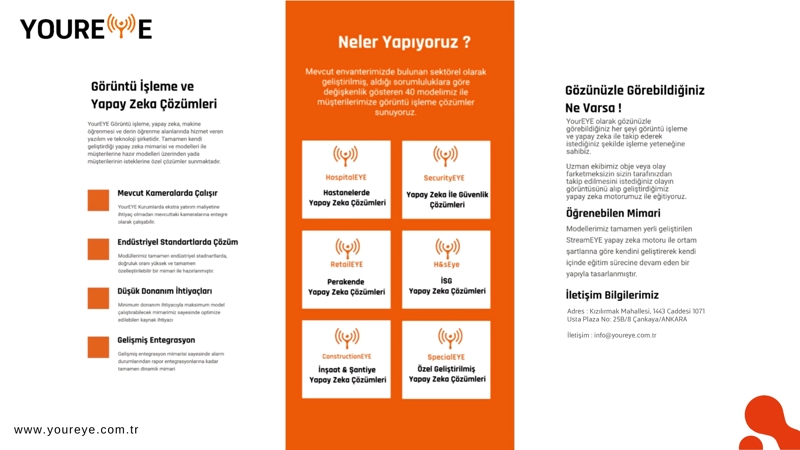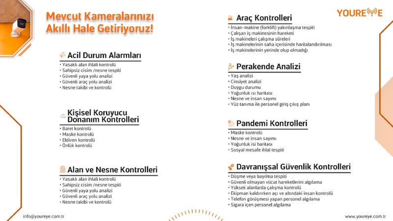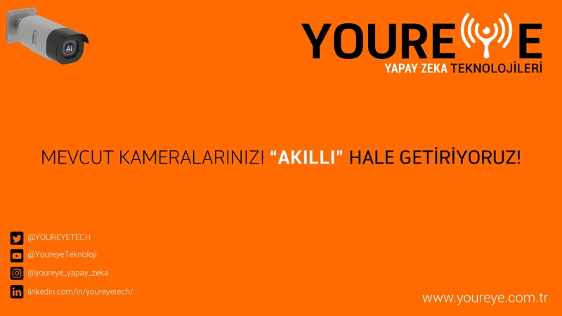 YourEYE, mevcut güvenlik kameralarına entegre edilen, yapay zeka destekli bir güvenlik ve süreç yönetim sistemidir. Bu sistem, iş sağlığı ve güvenliği (İSG), acil durum yönetimi, perakende analizi, trafik yönetimi ve daha birçok alanda kapsamlı çözümler sunar. Örneğin, acil durum alarmları (yangın tespiti, yasaklı alan ihlali, sahipsiz cisim/nesne takibi), kişisel koruyucu donanım kontrolleri (baret, maske, eldiven kontrolü) ve davranışsal güvenlik kontrolleri (düşme ve bayılma tespiti, tehlikeli hareketlerin izlenmesi) gibi fonksiyonlarıyla işletmelerin güvenlik ihtiyaçlarını karşılar. Ayrıca, pandemi kontrolleri (maske kontrolü, sosyal mesafe ihlal tespiti) ve perakende analizleri (yaş ve cinsiyet analizi, duygu durumu analizi) gibi özelliklerle, geniş bir kullanım alanı sunar.
