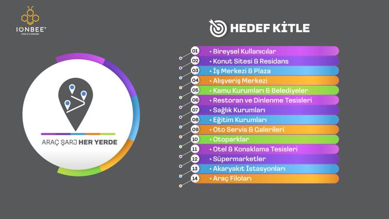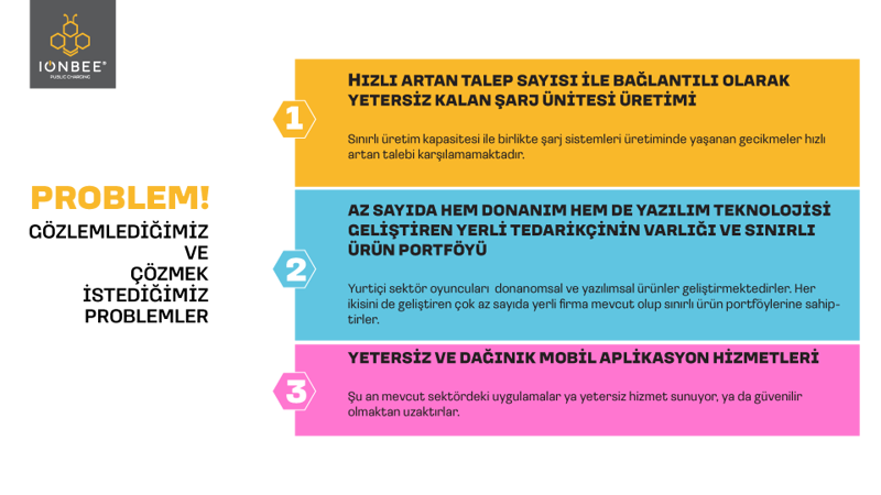 IONBEE; elektrikli araç şarj istasyonu donanım ve yazılım çözümleri sunmaktadır. Donanım tarafında, 3,7 kW'dan 22 kW'a kadar AC ve 20 kW ile 120 kW arası DC hızlı şarj cihazları geliştirip üretmektedir. Tüm ürünler kapsamlı testlerden geçirilerek ticarileştirilmiştir. Ayrıca ticari ürünler olarak özel izolasyon Type2 socket ve kablo imalatı ile ihracata yönelik hedefleri bulunmaktadır. Yazılım tarafında ise IONBEE SOFT markasıyla apartman ve siteler için şarj yönetim sistemleri, şehir içi elektrikli araç filoları için filo yönetim sistemleri geliştirilmektedir. Bu sayede kullanıcılar şarj ihtiyaçlarını ve operasyonlarını dijital ortamda yönetebilmektedir. Özellikle yeni yapılmakta olan inşaat yatırımlarında Mimar ve İnşaat Mühendisleri ile, Site projelerinin altyapılarına yönelik pratik çözümler üretilmektedir. Güçlü Ar-Ge ekibi ve tecrübeli yöneticileriyle hem donanım hem de yazılım alanında yenilikçi çözümler sunarak elektrikli araç ekosistemine katkı sağlamaktadır. IONBEE elektrikli araç şarj çözümleri alanında uzmanlaşmış bir teknoloji şirketidir.