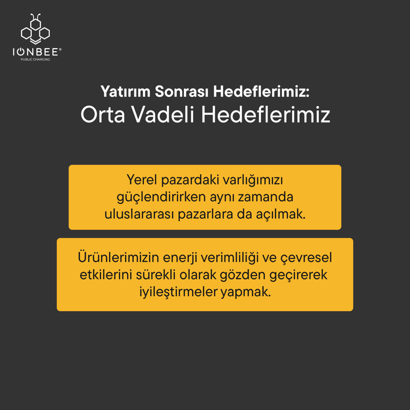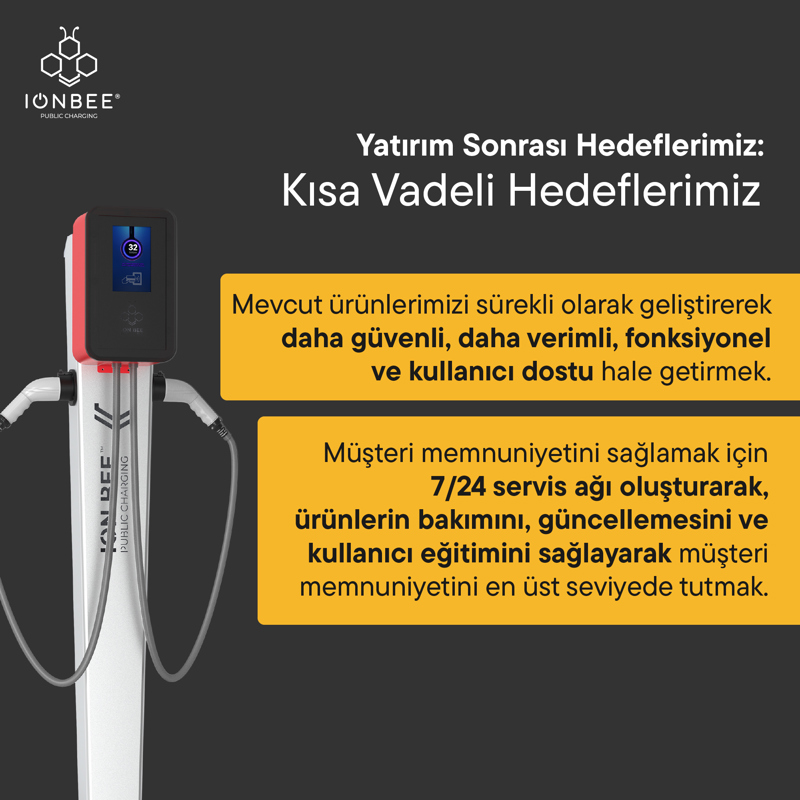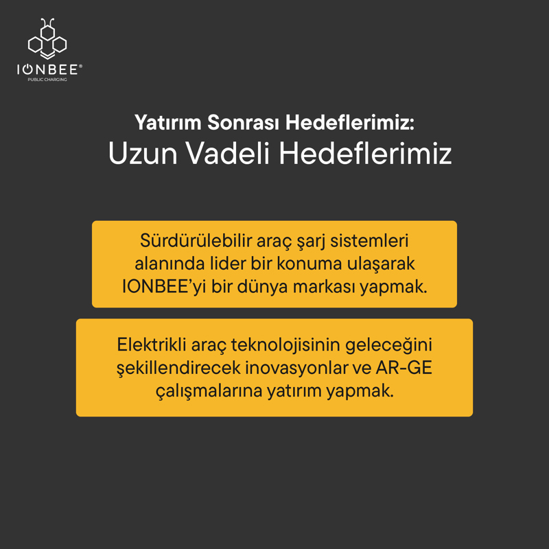 IONBEE olarak büyüme ve yenilik yolculuğumuzu desteklemek amacıyla, elektrikli araç altyapısı alanında kapsamlı bir yatırım arayışındayız. Bu yatırım, gelişmiş makine ve teçhizat altyapısı oluşturulmasını, uzman danışmanlık hizmetlerinin genişletilmesini, ithalat ve gümrük işlemleri ile ruhsatlandırma ve lisans projelendirme süreçlerini içerir. Ayrıca, test, devreye alma ve montaj faaliyetlerimizi güçlendirmeyi, etkin navlun ve sigorta çözümleriyle süreçlerimizi desteklemeyi hedefliyoruz. Bu şekilde, sektördeki liderliğimizi pekiştirerek daha fazla pazarda etkili olmayı amaçlıyoruz.