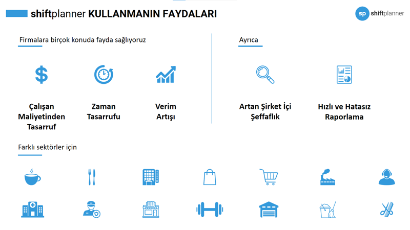 Shiftplanner, bir vardiya yönetim yazılımıdır. Vardiyalı çalışma sistemine sahip firmalardaki, çoğunlukla manuel olarak yürütülen vardiya yönetim süreçlerini dijitalleştiriyoruz. Ayrıca Yapay Zeka Destekli Akıllı Vardiya Yönetimi özelliğimizi hayata geçirerek, bu alanı akıllandırmayı hedefliyoruz. Shiftplanner ile firmalara sağladığımız faydaların bazıları aşağıdaki gibidir: