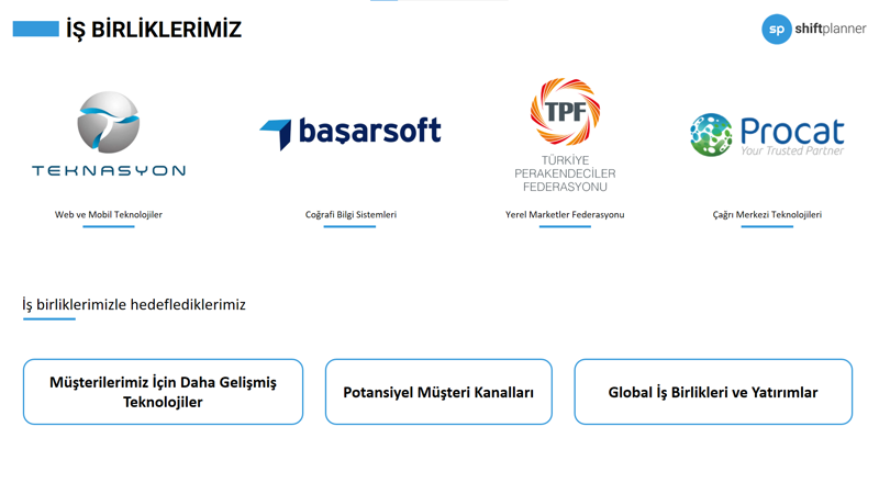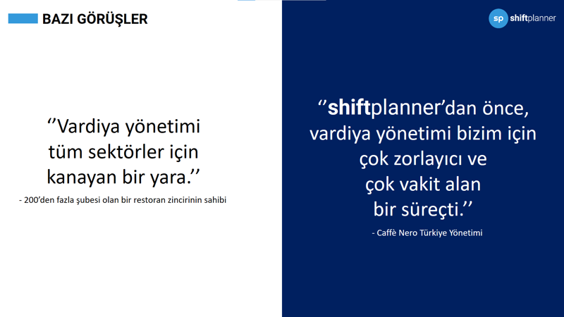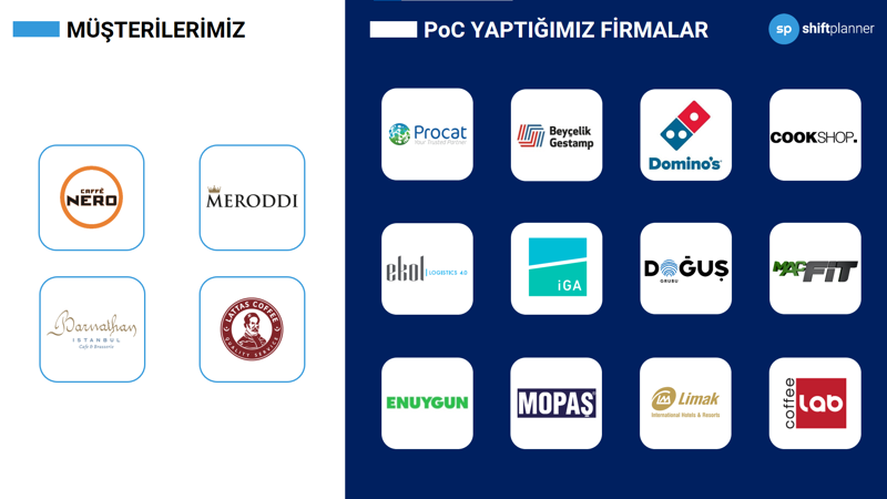 Shiftplanner’ın ilk versiyonunu İngiltere’nin en büyük kahve zincirlerinden Caffè Nero ile birlikte geliştirdik ve Caffè Nero Türkiye’de 70+ şubede 3 yıldır memnuniyetle kullanılmaktadır. Edindiğimiz tecrübelerden yola çıkarak Shiftplanner v2’yi geliştirmek üzere 2021’de ilk yatırımımızı aldık ve şirketleştik. Yazılımımızın yeni versiyonunu 2022 yılının başında kullanıma açtık. Shiftplanner v2 şu an Meroddi Otelleri’nde kullanılmaktadır, geçiş hazırlıkları tamamlandıktan sonra Caffè Nero’da da kullanılacaktır. Ayrıca, geçen kısa sürede farklı sektörlerden birçok firma ile testlere ve görüşmelere başladık. Bu firmalara Caffè Nero Global, İGA, Domino’s Pizza, Cookshop, Doğuş Grubu, Ekol Lojistik, Macfit, Beyçelik Gestamp, Procat, Enuygun, Coffee Lab, Limak Otelleri, Mopaş, Green Salads, Carl's Jr, Karel Tel, KAM Yapı gibi örnekler verebiliriz. Ayrıca bu süreçte birçok iş birliği de geliştirdik. Bu iş birliklerine Başarsoft, Procat, Türkiye Perakendeciler Federasyonu ve Teknasyon gibi örnekler verebiliriz.