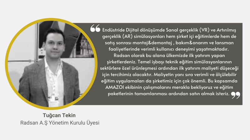 Endüstriyel alanda ise birçok şirkete özel kaynak (Radsan Termokaynak Uygulaması), ürün tanıtımı (Tama Proje, Radsan) vb. Sanal gerçeklik, WebGL ve Artırılmış Gerçeklik teknolojileriyle özel eğitim çözümlerini geliştirmiştir. Unity 3D Oyun motoruna entegre kendi yazılım kütüphanesini geliştiren şirketimiz pazardan aldığı geri bildirimler ile tüm endüstride ihtiyaç duyulan eğitim simülasyon paketlerini geliştirecek olup pazarda geniş kapsamlı ürünleşen tek girişim olmak hedefindedir.