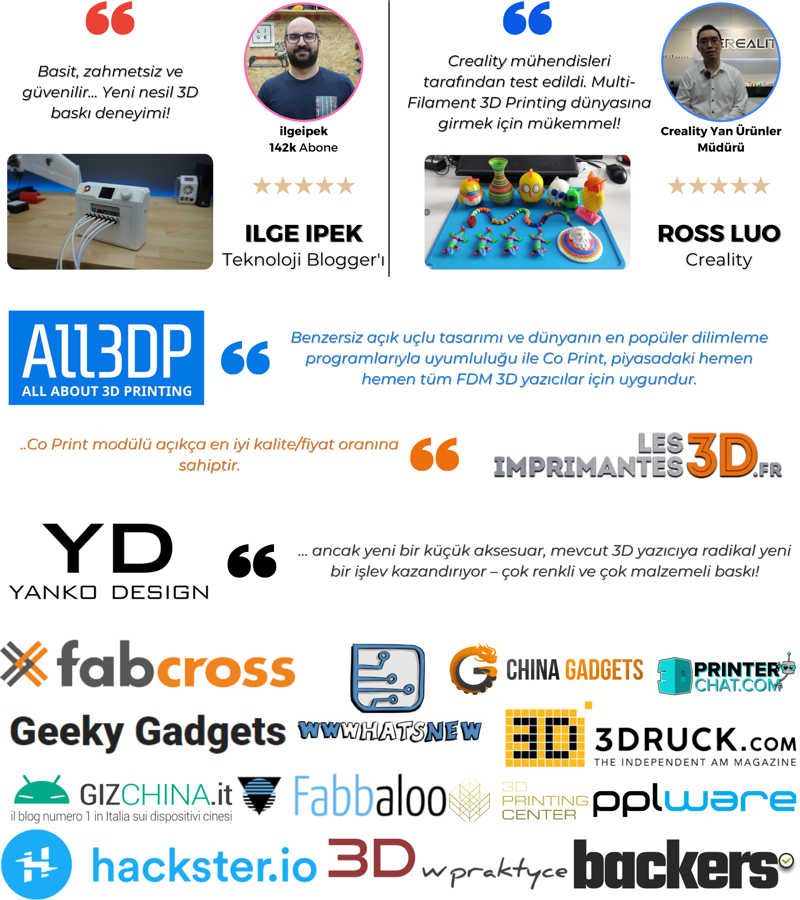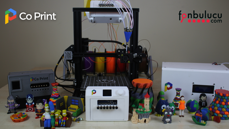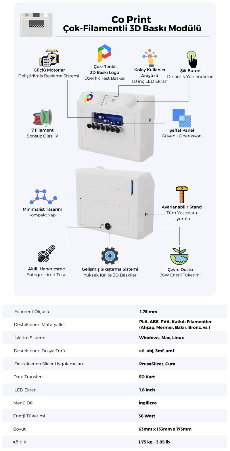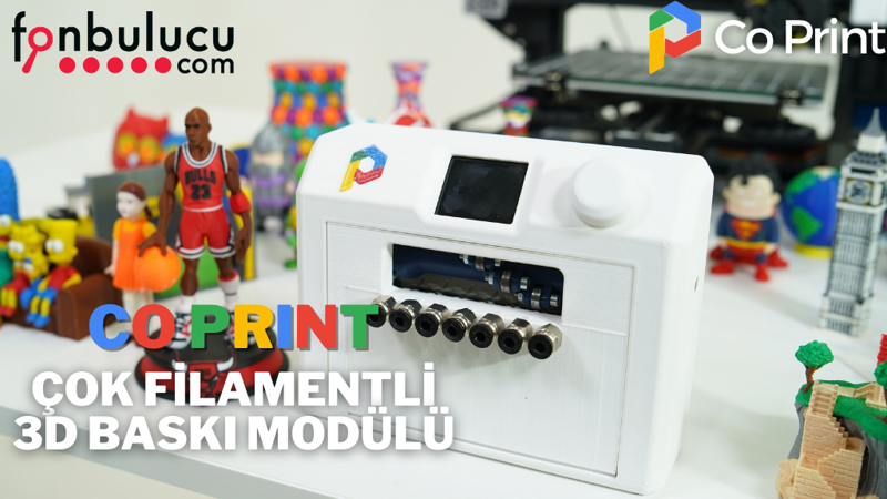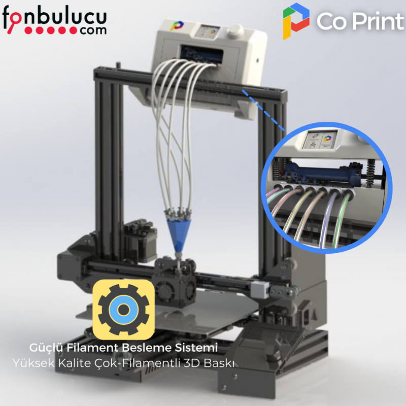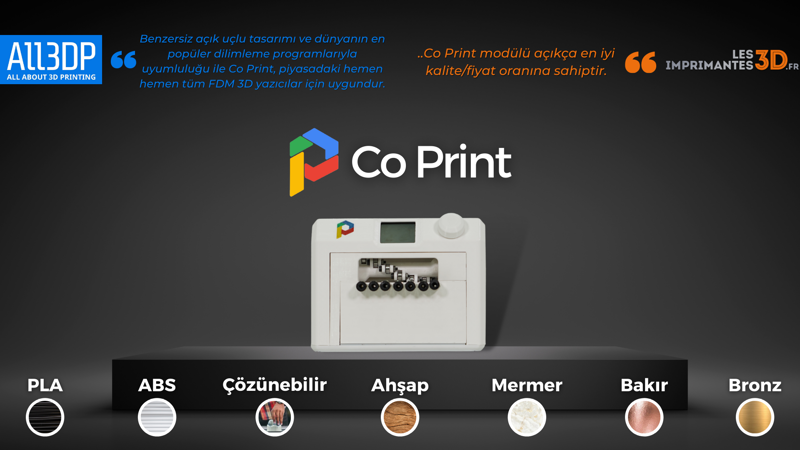 Co Print, 7 adet filament besleme mekanizması ile 3D yazıcılara giren filamenti otomatik olarak değiştiren ve bu sayede piyasadaki bütün 3D yazıcıların tek baskı ucu ile çok renkli ve çok malzemeli modeller üretebilmesini sağlayan çok filamentli 3D baskı modulüdür.