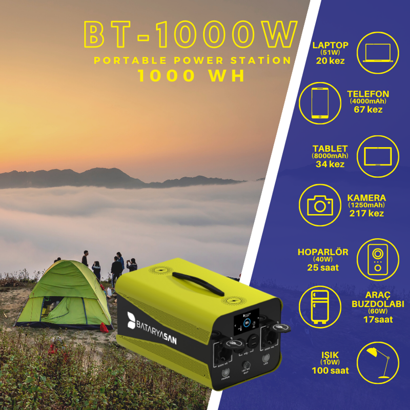 Taşınabilir güç istasyonları enerjiyi sürekli yanınızda taşımanızı sağlayan, cep telefonu, dizüstü bilgisayar, TV, hatta su ve elektrikli ısıtıcıları bile farklı güç değerlerindeki geniş yelpazesi ile çalıştırabilen ürünlerdir. Kendi içerisinde bulunan USB, AC ve 12 V DC çıkışları sayesinde her türlü enerji ihtiyacınızda enerjiniz hep yanı başınızda yer alır. BATARYASAN BT taşınabilir güç istasyonları uzun süren Ar-Ge çalışmalarının bir sonucu olarak ortaya çıkmış olup,