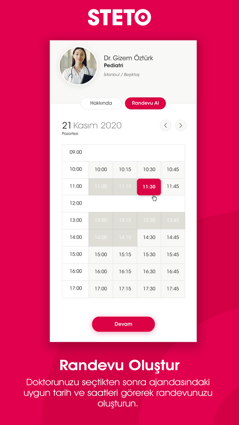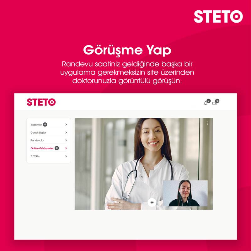 STETO, diyetisyen, psikolog, fizyoterapist ve dil-konuşma terapisti ile online görüşme yapmanızı sağlar. STETO ile uzmanlar arasında arama yapabilir, seçtiğiniz uzmanla randevunuzu oluşturabilir ve başka hiçbir platforma gitmenize gerek kalmadan site üzerinden online görüntülü konuşma gerçekleştirebilirsiniz.