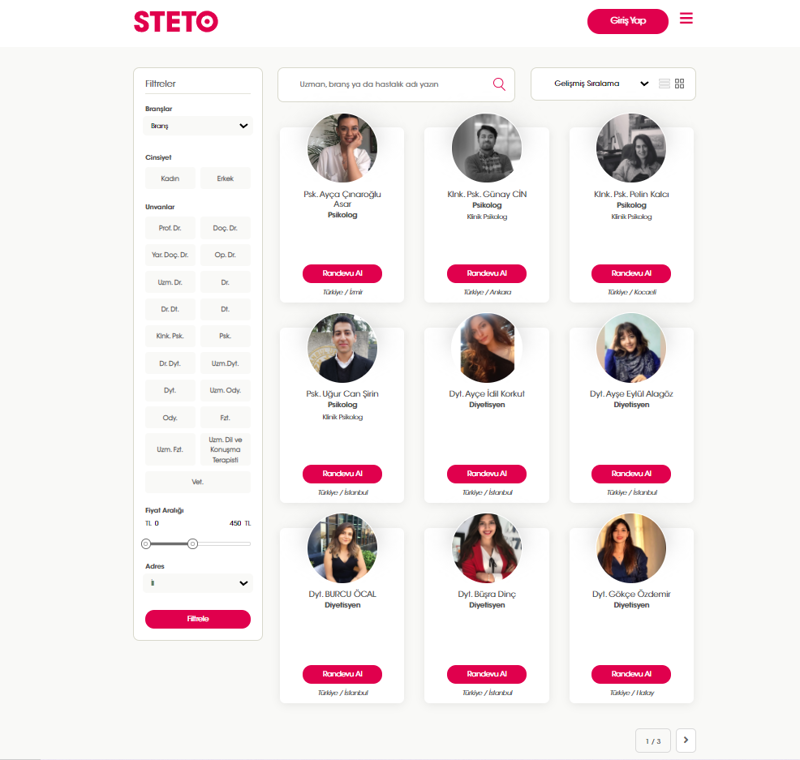 Çeşitli arama ve filtreleme seçenekleri ile kullanıcı kendisine en uygun uzmanı seçer.