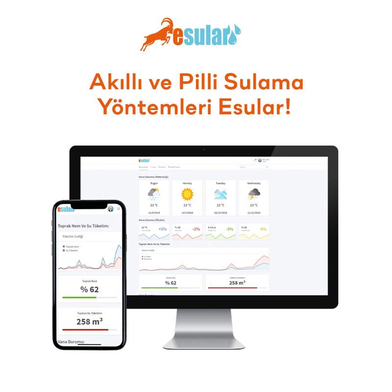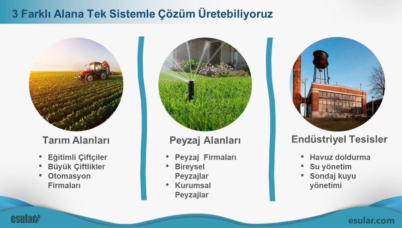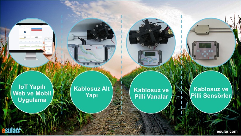 esular, merkezi haberleşme istasyonu, vana kontrol ünitesi, sensör kontrol ünitesi olmak üzere 3 donanım ve 1 yazılımdan oluşan akıllı sulama sistemidir. Tek bir ürün ile ek enerji ve kablolamaya gerek kalmadan kablosuz uzaktan akıllı sulama ve otomasyon çözümü sağlamaktayız. esular olarak amacımız, tarımsal üretim alanlarında verimliliği artırmak ve su ve enerji tasarrufu sağlamak için kablosuz ve pilli tam otomatik IoT yapılı akıllı sulama sistemleri sunmaktır. Bu sayede, çiftçiler, uygulayıcılar ve üreticiler arasında bir bütün olarak etkin akıllı sulama çözümleri geliştirilmektedir.