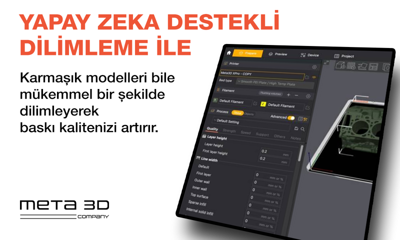 Meta3D Company tarafından geliştirilen ve geliştirilmeye devam eden Meta Slicer, şirketlerin ve son kullanıcıların yazıcılarını kullanırken istedikleri tüm ayarları çok kompakt bir arayüz ile ayarlamalarına olanak tanır.
