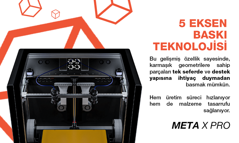 5 Eksen Teknolojisi: Meta3D Company tarafından üretilen tüm FDM yazıcılar, 5 eksen baskıya hazır mekanik sistem ile teslim edilmektedir. 5 eksen baskı sayesinde: