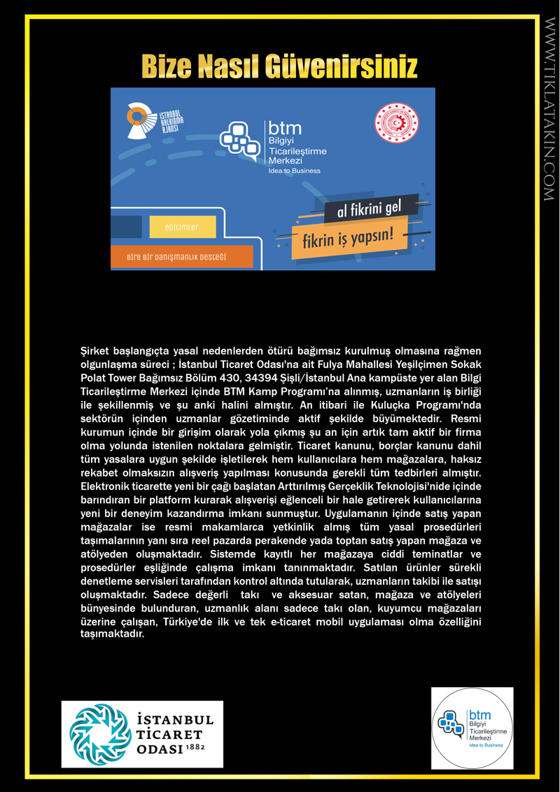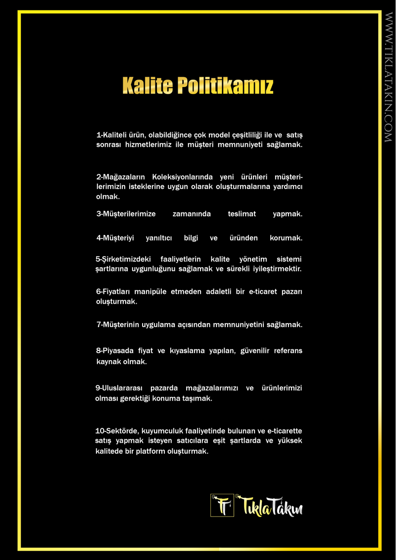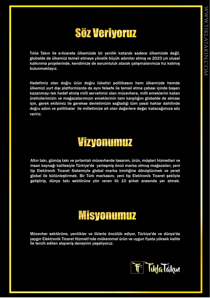 Söz veriyoruz Tıkla takın ile e-ticarette sektöre bir yenilik katarak, sadece ülkemizde değil, globalde de ülkemizi temsil etmeye yönelik büyük adımlar atmış ve 2023 yılı ulusal kalkınma projelerinde kendisine de sorumluluk alarak çalışmalarına hız katmıştır. Hedefimiz olan doğru ürün, doğru tüketici politikasını hem ülkemizde hem de ülkemizi temsil edecek yurt dışı platformlarda da aynı felsefe ile temsil etmektir. Başarı ile kazanmayı tek hedef etmiş milli servetimiz olan mücevhere milli emeklerini katan üreticilerimizin ve mağazalarımızın emeklerinin tam karşılığını globalde de alması için, gerek ekibimiz ile gerekse devletimizin sağladığı tüm yasal haklar ile doğru adım ve politikalar eşliğinde, milletimize ait olan değerlere değer katacağımıza söz veririz.