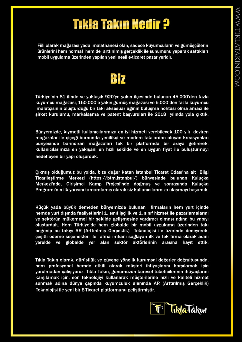 Takı almak keyifli ve mutluluğunuza değer katan bir aksesuar alışverişidir, bazen bir anıyı ölümsüzleştirmek adına bazense bir aile yadigarı olması amacıyla alınır. Sebebi her ne olursa olsun gümüş, altın gibi değerli madenlerden pırlanta, zümrüt, yakut gibi değerli taşlardan oluşan takı alışverişinin yapıldığı güvenilir bir pazar yeri oluşturmak adına biz hem teknolojik yenilik hem de Türkiye'nin dijital kuyumcusu olmak adına sürekli AR-GE çalışmaları ile güncelleniyor ve büyümeye devam ediyoruz.