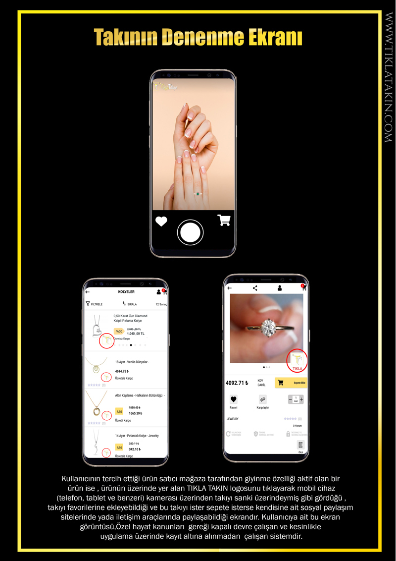 Bütün güvenlik önlemlerini almış, sürekli denetlenen, uzmanlık alanı takı olan Tıkla Takın pazar yerinde ister vitrin mağazalarını ve ürünlerini ziyaret edebilir, isterseniz filtreleme seçeneği ve kısa yollar ile ilgilendiğiniz takı kategorisine direk gidebilirsiniz. İlgilendiğiniz takının Artırılmış Gerçeklik özelliği aktif ise ilgili takıya ait resmin sağ alt köşesinde Tıkla Takın logosunu tıklayabilir ve üzerinizde deneyebilirsiniz. (Özel hayata müdahale olmaması adına kamera özelliğini kapalı devre kullanıyoruz kesinlikle kamera görüntülerinizi ve resimlerinizi kayıt altına almıyoruz, sunucularımızda barındırmıyoruz)