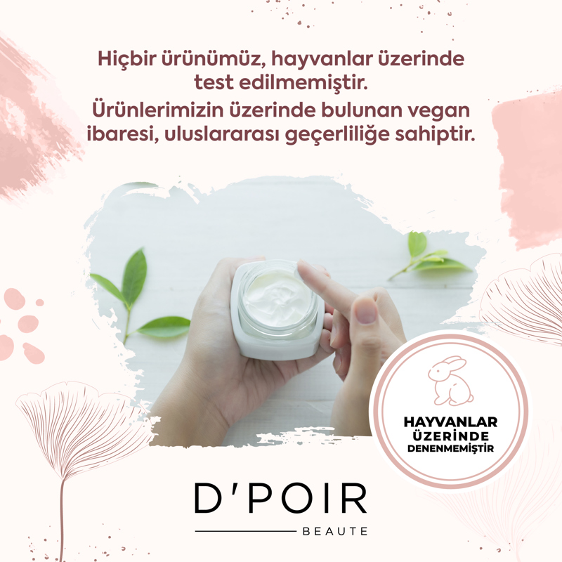 D'Poir Beaute, hayvan dostu bir marka olmanın önemine büyük bir vurgu yapar. Şirketin ürünleri, hayvansal maddeler içermez ve hayvanlar üzerinde test edilmez. Bu yaklaşım, müşterilere etik bir seçenek sunma amacı güder. Ürünlerin formülasyonları, bitkisel kaynaklı ve vegan içeriklerle zenginleştirilmiştir, bu da hayvan dostu bir cilt bakımı seçeneği sunar. D'Poir Beaute'nin vegan ürün iddiası, bağımsız bir sertifikasyon kuruluşu olan Nanocert Sertifikasyon Hizmetleri A.Ş. tarafından onaylanmıştır. Vegan ibaresi, Nanocert tarafından verilen bu sertifikayla ürünlerin içinde hayvansal maddeler bulunmadığını doğrular. Bu sertifikasyon, uluslararası düzeyde geçerliliğe sahiptir, bu da D'Poir Beaute'nin dünya genelinde vegan standartlara uygun ürünler sunduğunu gösterir. Şirket, bu değerleriyle sektörde öncü bir konuma gelmeyi amaçlar ve tüketicilere çevresel etkileri en aza indirilmiş, etik değerlere uygun ürünler sunma sözü verir.