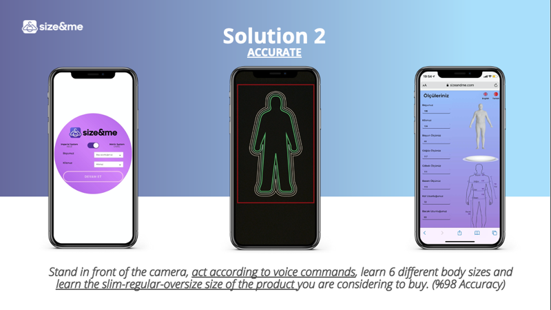 ACCURATE çözümü ile %98 doğruluk oranı sağlamaktayız. Bu çözümümüz kameradan ölçü çıkarma teknolojisini sunmaktadır. Kullanıcı yine aynı tasarımda bedenimi bul ifadesine bastıktan sonra eğer web üzerinden işlem gerçekleşiyorsa QR ile mobile yönlendirme sağlanarak, mobilden gerçekleşiyorsa anlık bir şekilde devam ederek kullanıcıdan alınan izinlerle kamerası açılıyor. Açılan kamera doğru açıyı aldıktan sonra sesli komutlar ile kullanıcıyı bir figüre sığdırıyor ve hızlı bir şekilde 6 farklı (boyun, göğüs, bel, basen çevresi, kol ve bacak uzunluğu) ölçüleri bahsedilen doğruluk oranında ölçülüyor ve ürün sayfasına geri yönlendirilip yine bir pop up ekranında ölçülerle beraber slim- regular- oversize için alınması gereken bedenler sunuluyor.