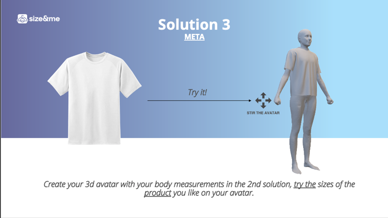 Size&Me online giyim alışverişinde beden uyumsuzluklu iadeleri minimize etmek için farklı yapay zeka çözümleri sunan bir yüksek teknoloji şirketidir. Bu çözümler metaverse'te öncülük edecek avatar oluşturma ve giydirme konseptlerini temel almaktadır.