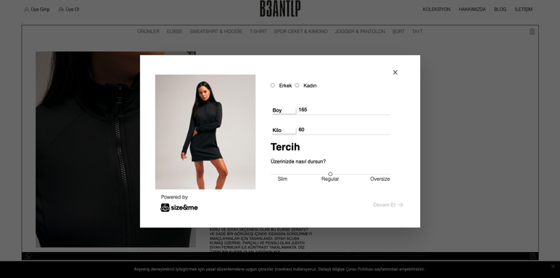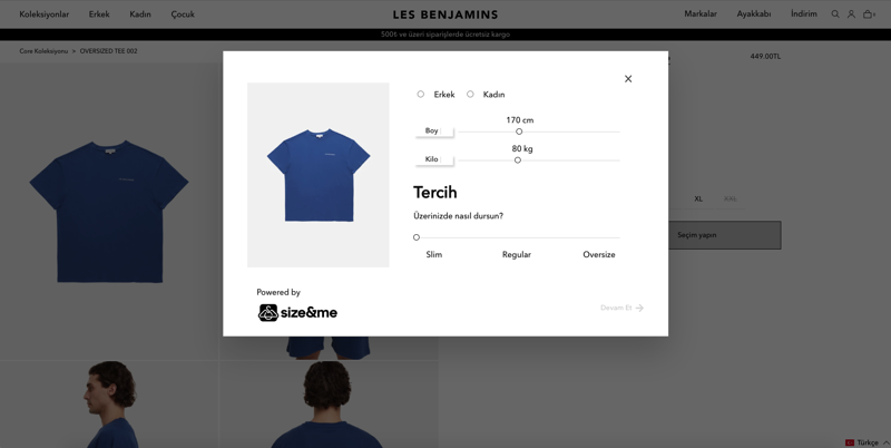 FAST çözümü ile %80 doğruluk oranında ilerliyoruz. Bu çözümde entegre olduğumuz markanın ürün sayfasında "Bedenimi Bul" ifadesi ile bir pop-up çıkarmaktayız. Ardından 4 basit adımda slim-regular- oversize bedenlerini kullanıcıya sunmaktayız. Bu adımlar ilk ekranda cinsiyet, boy, kilo parametrelerini öğrenme, sonrasındaki 2. ve 3. ekranda (üst beden ürünü ise) dar normal geniş olacak şekilde göğüs ve bel tipi seçimi, son olarak da yaş seçimi ile bedeni sunmaktayız. Bu çalışmayı Size&Me bünyesinde yapılmış 200.000 farklı insanın datası üzerinden gerçekleştirmekteyiz. Bu datalar 50 çeşit ürün tipi üzerinde geliştirilmiştir. %80 doğruluk oranı ise markaya yapılan entegrasyon sonrası markaya özel tutulan datalar ile ilerlenerek geliştirilmektedir.