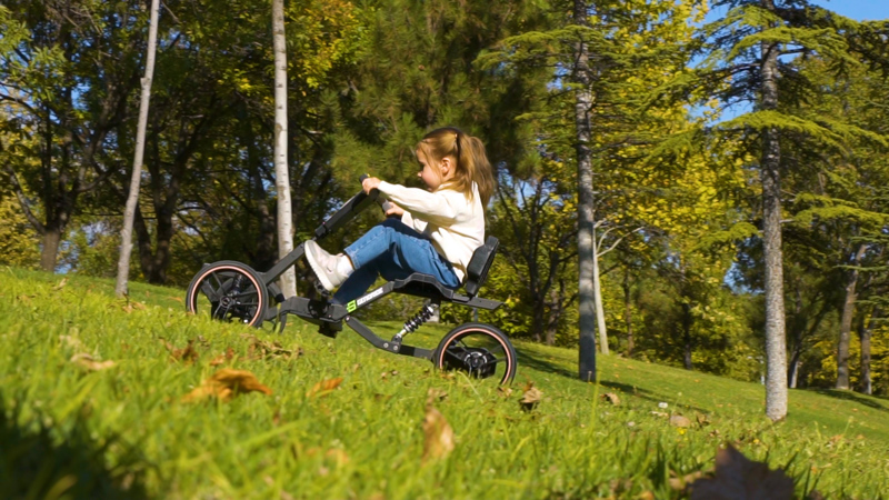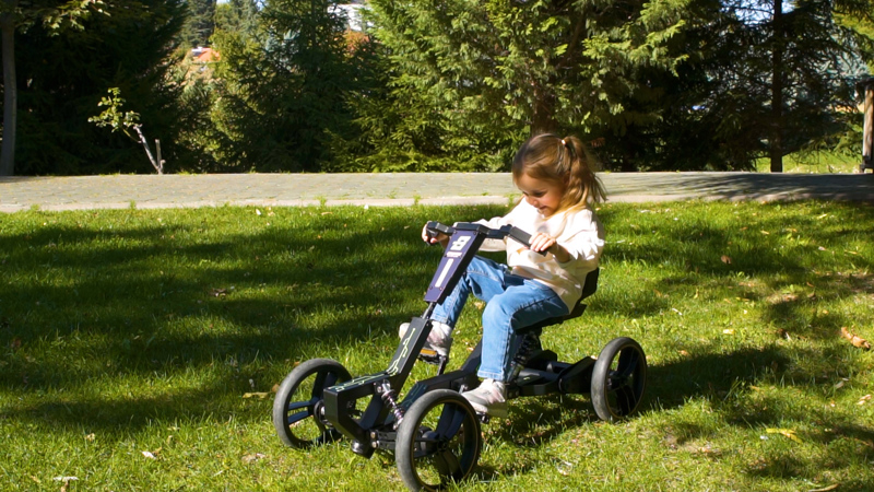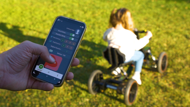 Ürünümüz kendi geliştirdiğimiz jeneratif sürüş sisteminin, yine özgün tasarımımız olan 4 tekerlekli, süspansiyonlu, çelik iskeletli ve pedallı çocuk aracı ile birleştirilmiş halidir.