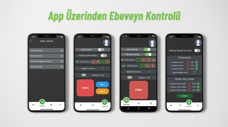 Ürün Bluetooth 5.0 ile Genoride IOS ve Android işletim sistemlerinde çalışan mobil uygulamamıza bağlanabilmekte ve ebeveyne kontrol imkanı sağlamaktadır. Uygulama ile ebeveynler: