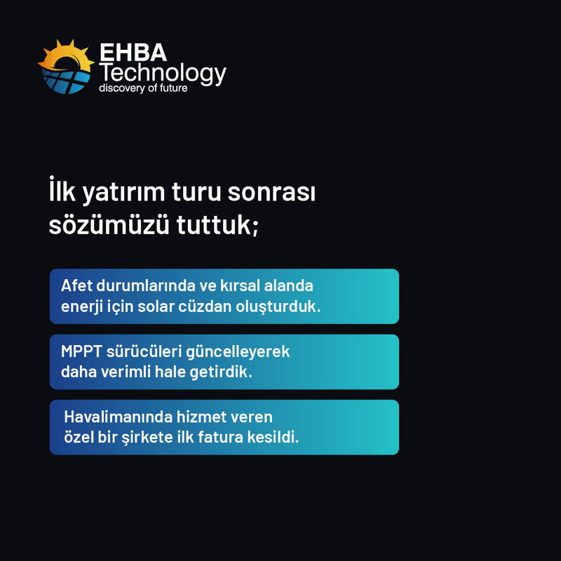 Istanbul havalimanı (IGA) ve İstanbul teknik üniversitesi (İTÜ) çekirdek ortak girişimcilik programı çerçevesinde gerçekleştirilen İTÜ Çekirdek Bigbang programı ile 2022 Aralık ayında lanse ettiğimiz projemiz Eyes of Solar ve devam eden süreç içerisinde hayata geçirdiğimiz şirketimiz EHBA Teknoloji A.Ş. olarak;