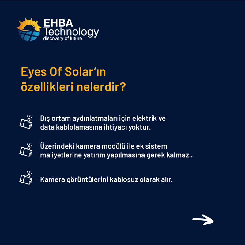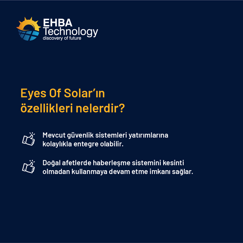 EHBA Teknoloji olarak aydınlatma, güvenlik ve iletişim problemleri için teknolojik çözümler üretmeyi hedefliyoruz. Modüler donanımlarımız ile dahili veya harici hizmet veriyoruz. EHBA Teknoloji olarak Eyes of Solar ürünü için görüşmeler sağladığımız belediyeler, karayolları, havalimanları, güvenlik şirketleri ve kamu kuruluşları, sanayi kuruluşları, inşaat projeleri üstlenen ve geliştiren firmalar potansiyel müşteriler arasındadır. Ürün paketleri bir üst pakete geçildikçe alt paket özelliklerine ek donanımlar ve avantajlar sunmaktadır.