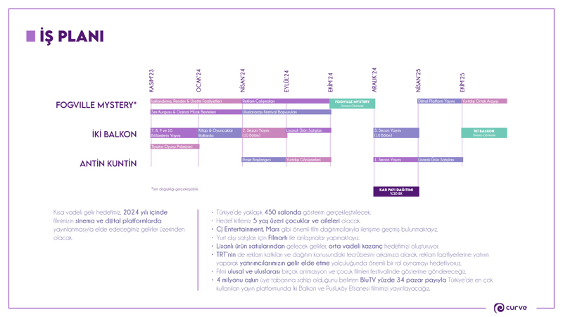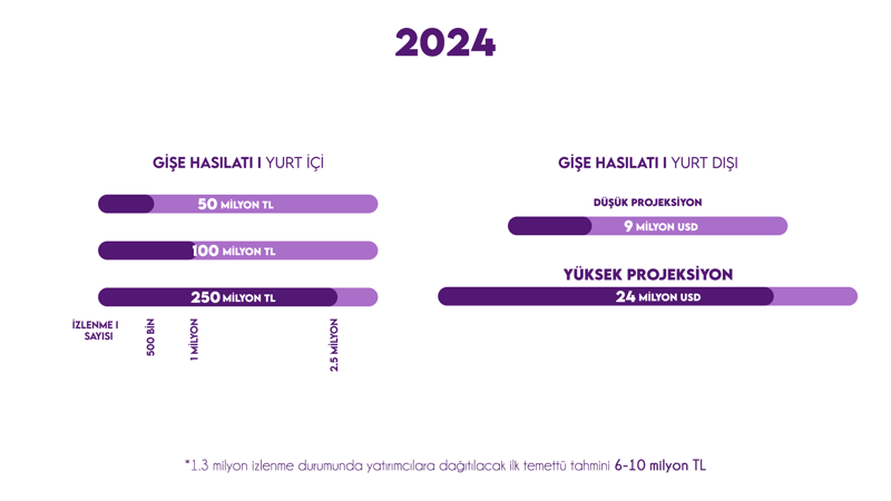 Fogville Mystery filmi ile 2024 yılı içerisinde sinemada 700.000 yurtiçi 40.000 global bilet satışı olması halinde 81.600.000 TL gelir elde edilmesi planlanmaktadır. Lisans hakları/Reklam Anlaşmaları ve dijital platform geliri ise 3.700.000 TL olarak planlanmaktadır.