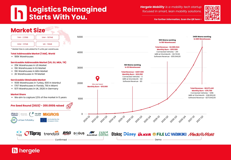 Hergele Mobility, gelecekte Wamo’nun tam bir depo yönetim çözümü olarak entegrasyonunu sağlamayı ve IoT tabanlı veri analiz yeteneklerini genişletmeyi planlamaktadır. Şirket, operasyonel verimliliği artıran yenilikçi özellikler ekleyerek, depo yönetimini optimize eden ve yöneticilere süreç takibi sunan bir çözüm geliştirmeyi hedeflemektedir. Ayrıca, Hollanda ve ABD pazarları başta olmak üzere uluslararası pazarda daha geniş bir müşteri kitlesine ulaşarak lojistik çözümlerini yaygınlaştırmayı amaçlamaktadır. CES 2024, Slush gibi sektörün önde gelen etkinliklerine katılım sağlayarak yurt dışı pazarlara yönelik tanıtım faaliyetlerini güçlendiren Hergele, burada edindiği bağlantıları yatırımcı ve iş birliği fırsatlarına dönüştürmeyi planlamaktadır.