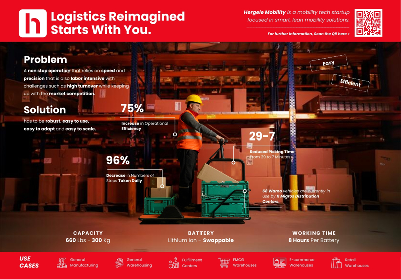 Hergele’nin Migros ile birlikte geliştirdiği ana ürünü olan Wamo, depo ve lojistik sektöründeki iş gücü gereksinimlerini optimize etmek, süreçleri hızlandırmak ve manuel iş yükünü azaltmak için özel olarak tasarlanmıştır. Wamo, elektrikli yapısı ve ergonomik tasarımı sayesinde çevre dostudur ve depo içi süreçlerde iş güvenliğini artıran bir çözüm sunar.