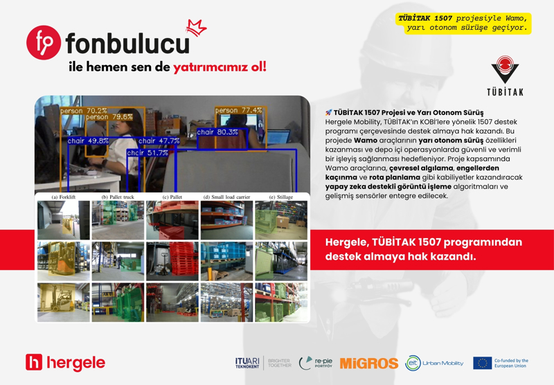 Hergele Mobility, TÜBİTAK’ın KOBİ’lere yönelik 1507 destek programı çerçevesinde destek almaya hak kazandı. Bu projede Wamo araçlarının yarı otonom sürüş özellikleri kazanması ve depo içi operasyonlarda güvenli ve verimli bir işleyiş sağlanması hedefleniyor. Proje kapsamında Wamo araçlarına, çevresel algılama, engellerden kaçınma ve rota planlama gibi kabiliyetler kazandıracak yapay zeka destekli görüntü işleme algoritmaları ve gelişmiş sensörler entegre edilecek. Bu sistemler, araçların depo ortamında kendi başına hareket edebilmesini sağlayarak manuel müdahale ihtiyacını azaltmayı amaçlıyor.