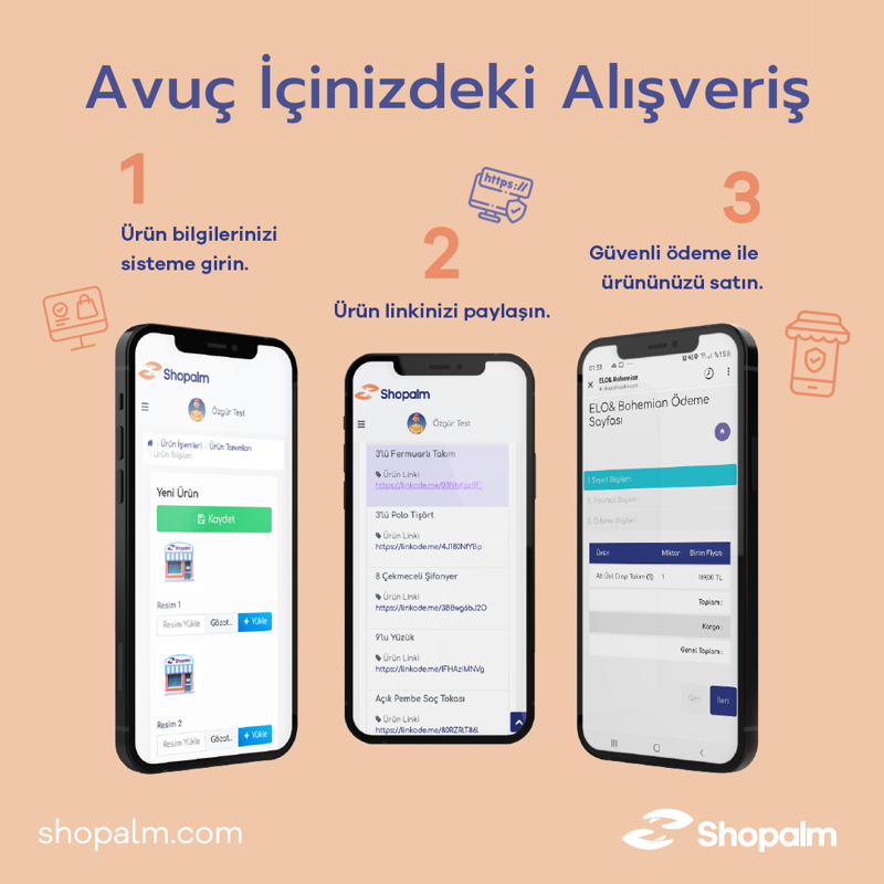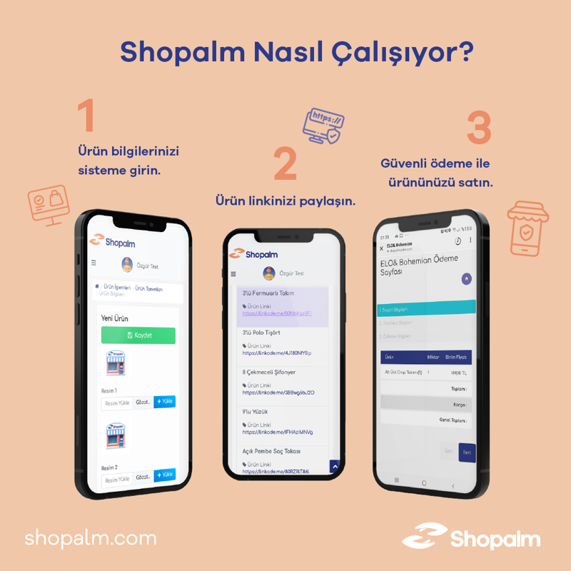 Bireysel satıcıların en kolay ve ulaşılabilir yöntemlerle e-ticaret yapmasını sağlamayı amaçlayan Shopalm, kullanıcılarının sadece online mağazalarından sepete ekle yöntemiyle satış yapmalarının yanında sanal pos özelliklerini kullanarak mağazadan bağımsız olarak da satış yapmalarını sağlamaktadır. Shopalm kullanıcıları müşterilerine Shopalm paneli üzerinden SMS, e-posta yolu ile ödeme isteği gönderebilir, linkle ödeme alma özelliği ile tüm dijital platformlardan ödeme ekranı gönderebilirler.