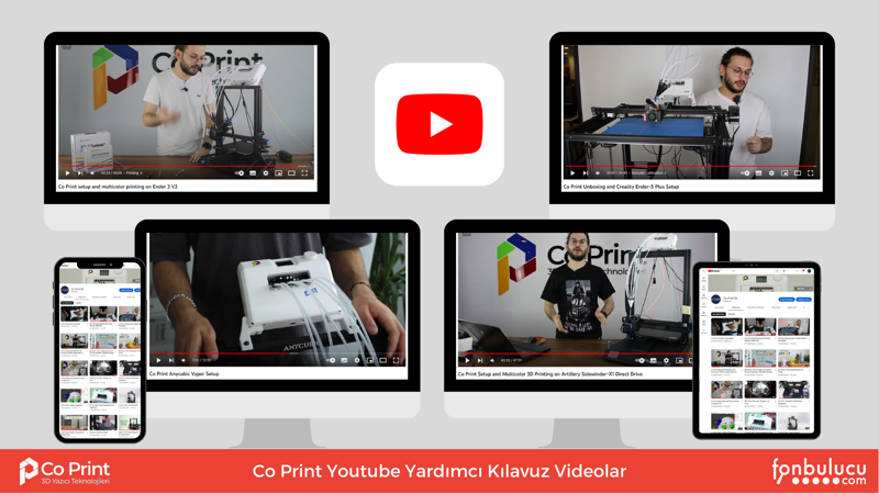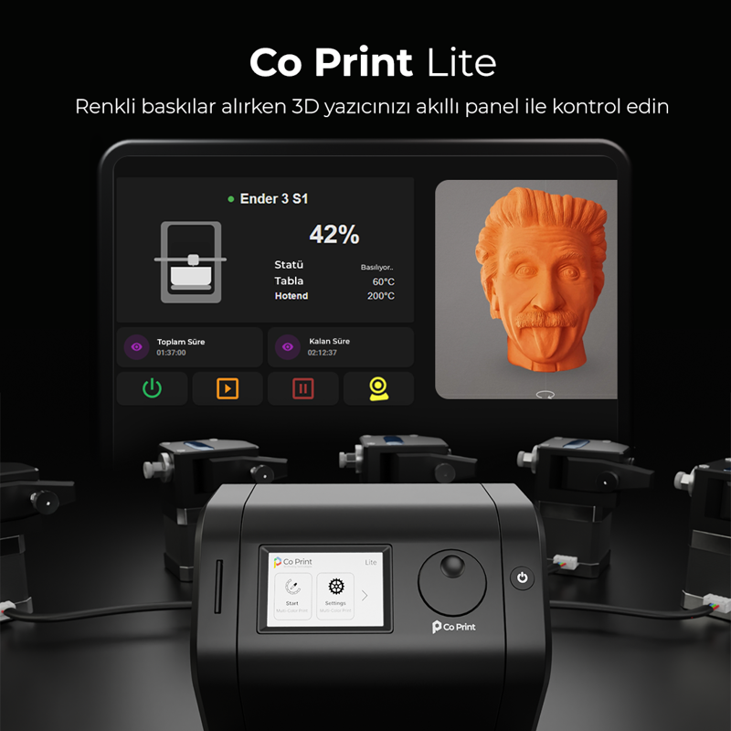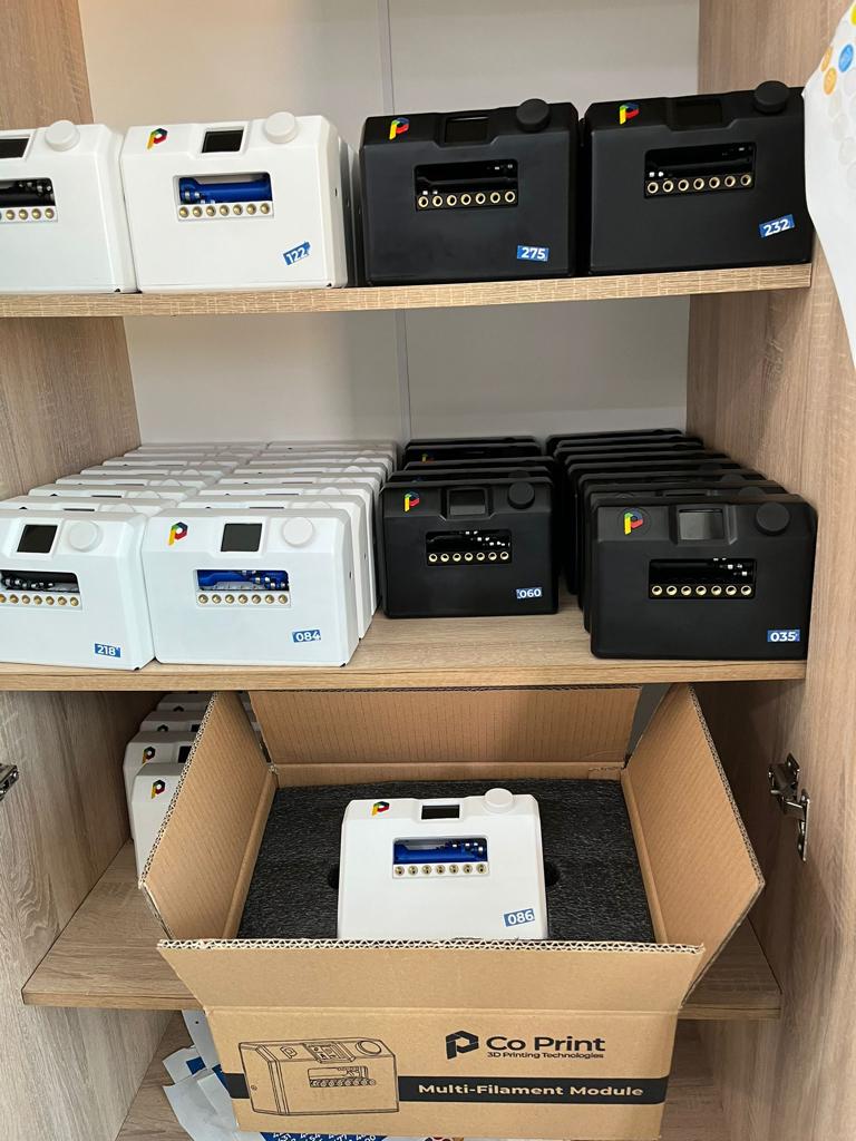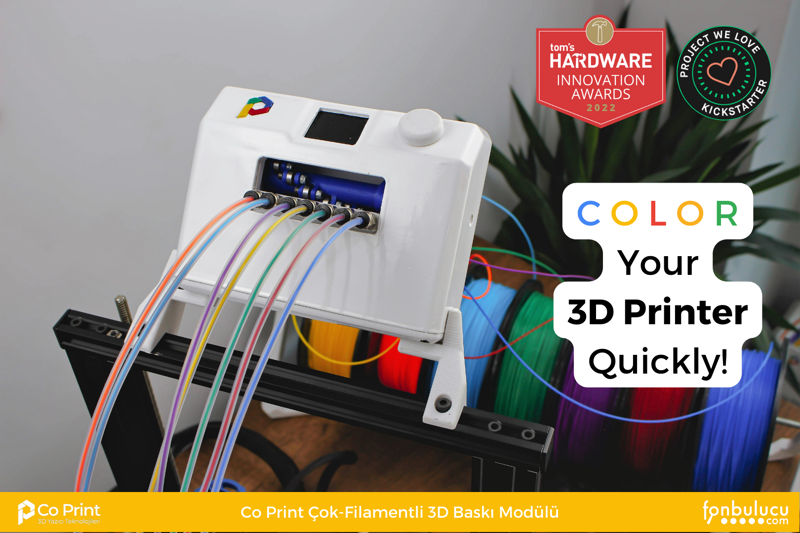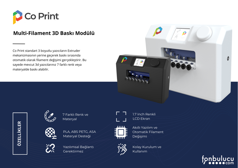 Co Print, 7 adet filament besleme mekanizması ile 3D yazıcılara giren filamenti otomatik olarak değiştiren ve bu sayede piyasadaki bütün 3D yazıcıların tek baskı ucu ile çok renkli ve çok malzemeli modeller üretebilmesini sağlayan çok filamentli 3D baskı modulüdür.