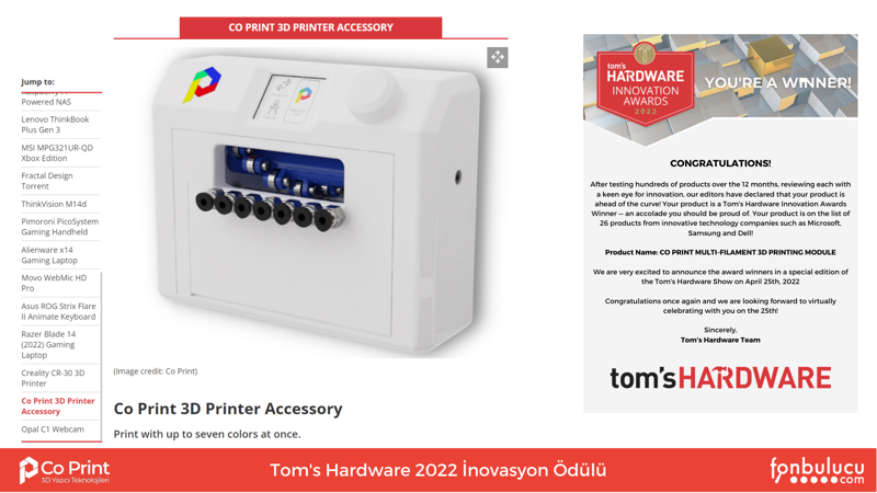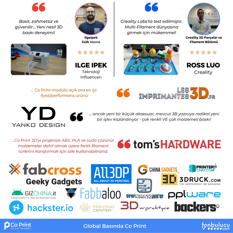 Co Print, 3D yazıcıların 7 adet filamenti bir arada kullanabilmesini sağlayan, baskı anında otomatik filament değişimi yapan, piyasadaki 3D yazıcıların baskı uçlarını akıllı hale getiren, elektronik ve mekanik aksamları olan bir 3D yazıcı ekipmanıdır. 3D yazıcılar ile çok renkli veya birden fazla malzeme türünden oluşan modeller üretmek isteyen kullanıcılara mevcut 3D yazıcılarını kullanmaya devam etmenin yanında zaman ve maliyetten tasarruf etmelerini sağlayacaktır.